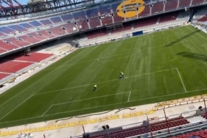 诺坎普球场正在进行翻修工程,本周一球场的草皮铺设完毕,而周二诺坎普球场就完成了足球场的专业画线工作。尽管西班牙国内大停电,但这并没有影响到诺坎普球场的工程。